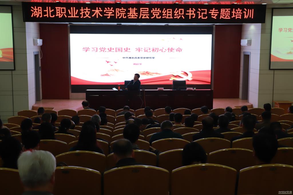 根据学校主题教育工作安排部署,10月31日下午,学校在文博馆学术报告厅开展基层党组织书记专题培训会。湖北省委党史宣讲团成员、省委党史研究室宣教处处长熊廷华应邀来校作党史国史专题讲座。学校基层党组织书记、副书记等党员干部参加学习,党委委员、副校长刘发兴主持培训会。